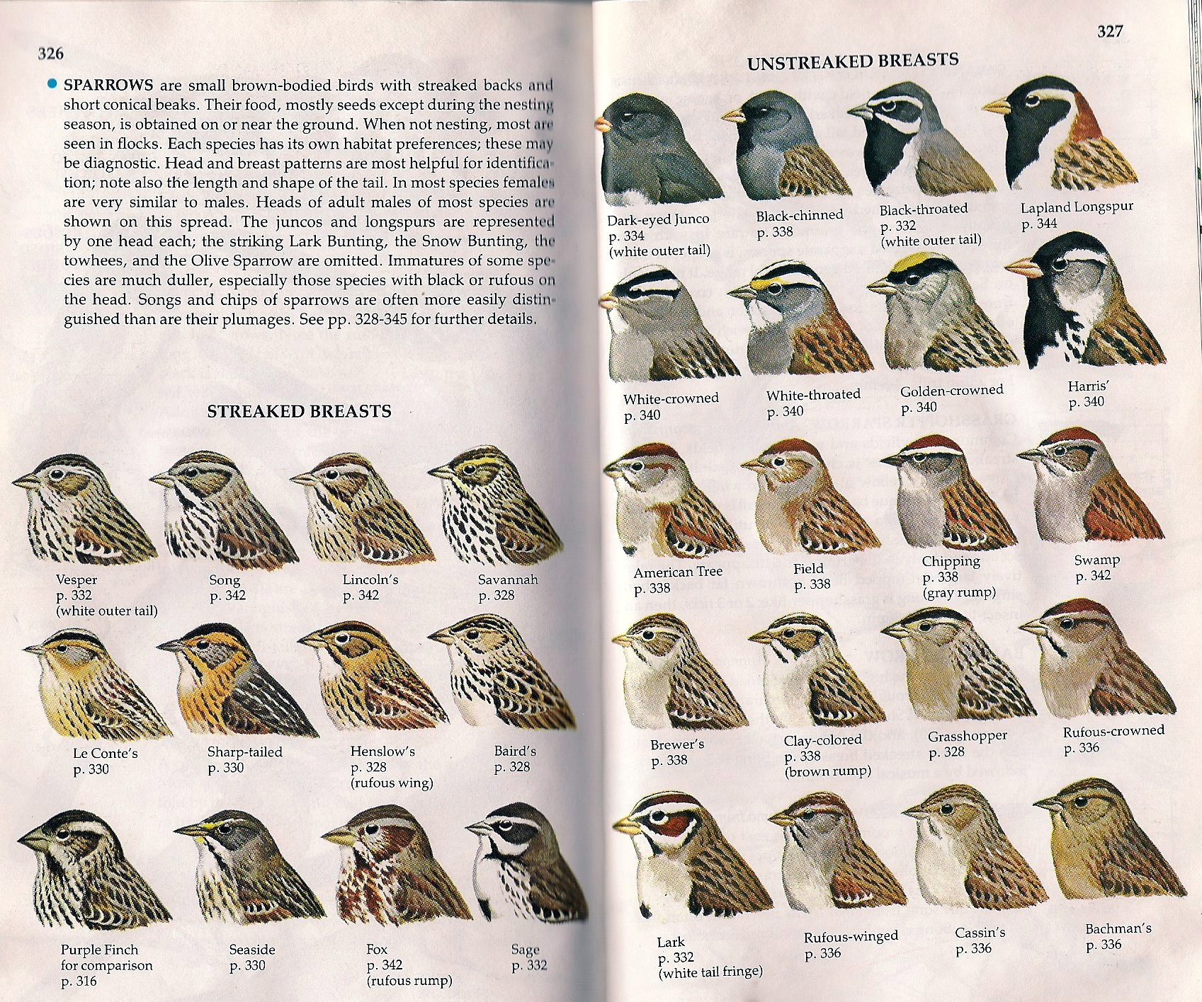 Trying to tell the difference among sparrows. (This is from our Golden Books “A Guide to Field Identification: Birds of North America” copyright 1983. It’s our favorite field guide–so compact.)