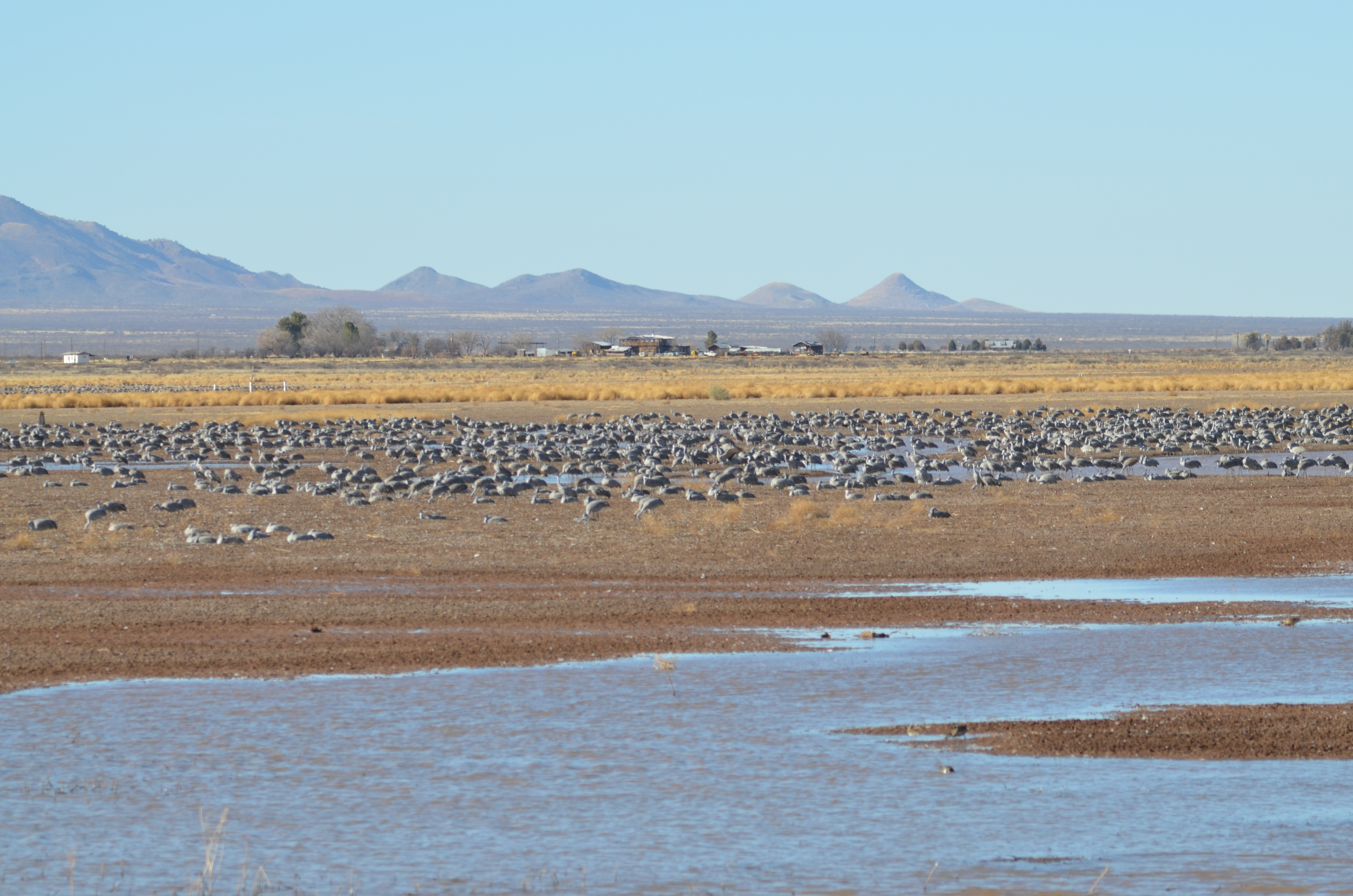 After our morning birding at Patagonia Lake State Park, we drove through the town of Tombstone via Highway 89 and turned east on Davis Road then to Coffman Road in search of the Sandhill Cranes. I realized that once I started to see agricultural fields I knew water had to be around somewhere. There had to be a way to irrigate. We were only about 100 miles from Tucson and then we found it: Whitewater Draw. This area in Southeast Arizona is very unassuming, and if you weren’t looking specifically for it you’d easily miss it. The 1400-acre site has a pond that varies with the runoff and it’s almost shocking to see a pond clear in the middle of this dry Arizona.