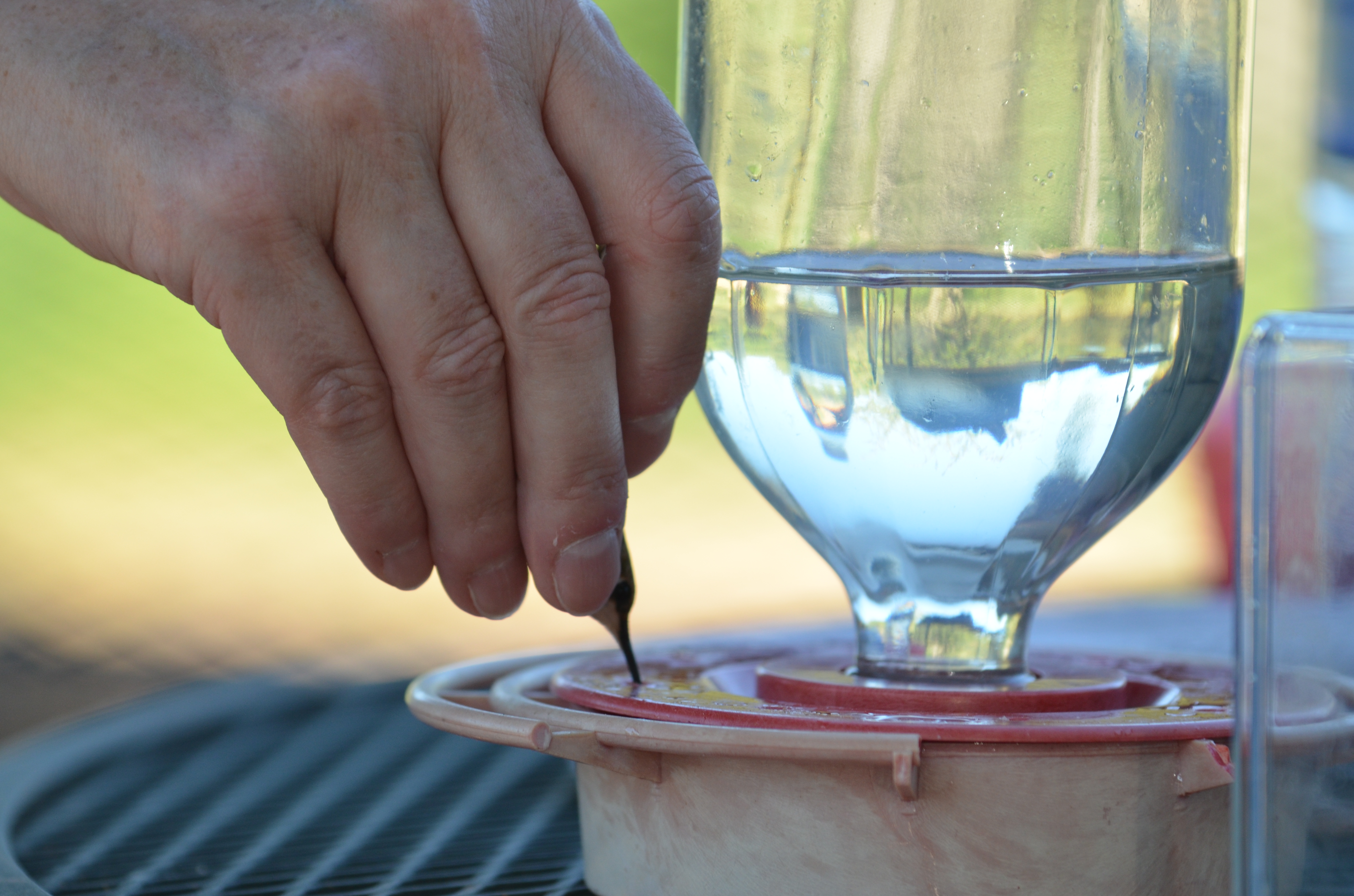 The examination is now over for this little bird. Sheri then hands the bird to a volunteer standing by and I’m amazed that during the hand off the bird doesn’t escape their fingers and that they are able to do the whole thing gently. Every hummingbird is rewarded with a drink before they are let go. “It was the feeder they were coming for in the first place,” the volunteer explains as she holds the tiny bird between her thumb and fingers and swoops the bird down to the feeder like a mom playing airplane with a spoonful of baby food coming in for a landing in her toddler’s mouth. “It helps give the bird the feeling of flying in to get a drink.” the volunteer explained. “They’re more apt to drink that way.”