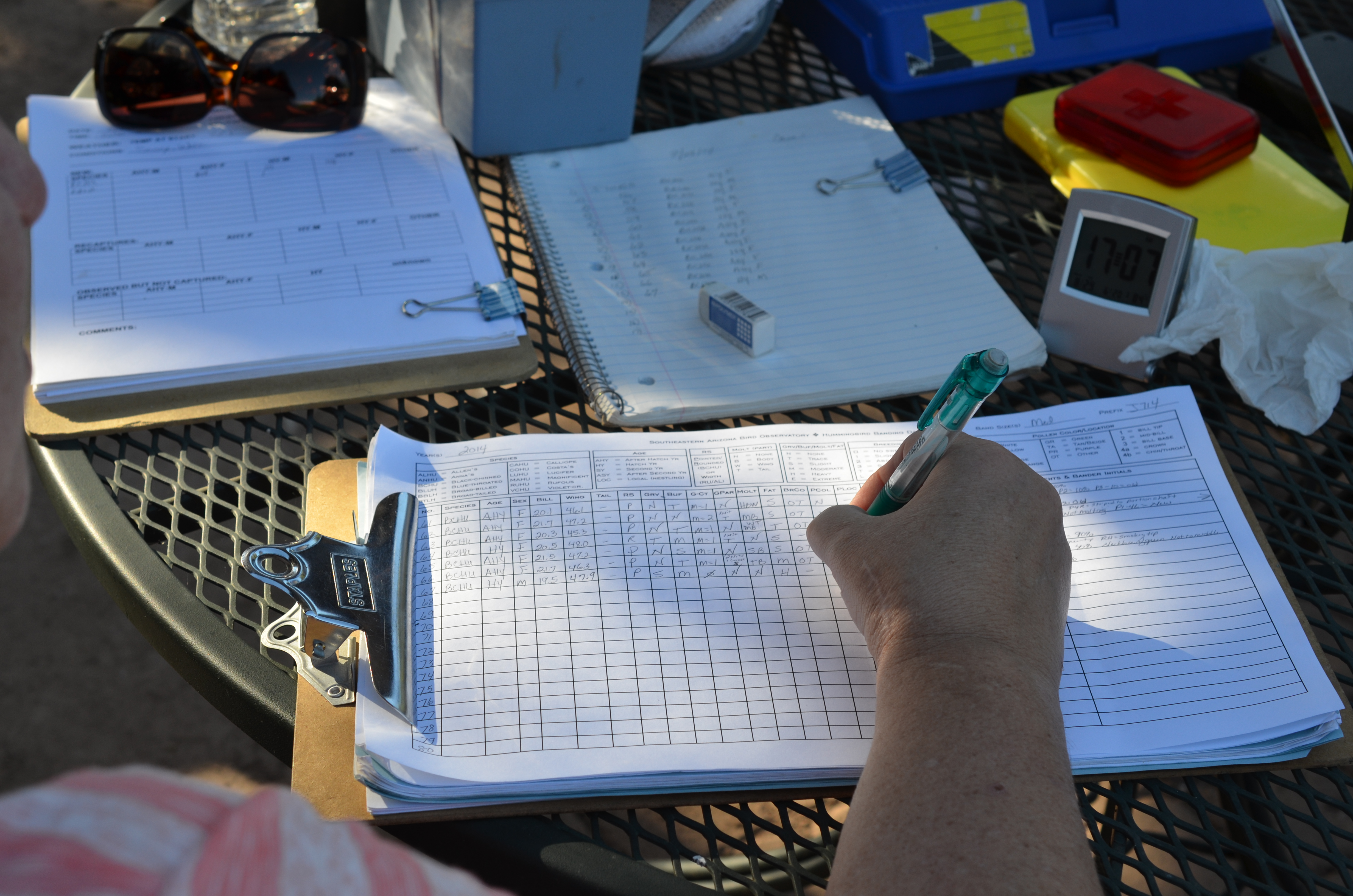 He lets me hold the bag and deliver it to Sheri Williamson, co-founder of the Southeastern Arizona Bird Observatory (SABO) and author of A Field Guide to the Hummingbirds of North America, who is sitting at a table set up outside near the feeder. In front of her is a scale, a log book and a small tray of very tiny aluminum bands she’ll put on the hummingbirds for tracking. She weighs the bird, measures its length and blows on its feathers with a straw to expose it’s stomach where she can tell how much fat it is carrying.