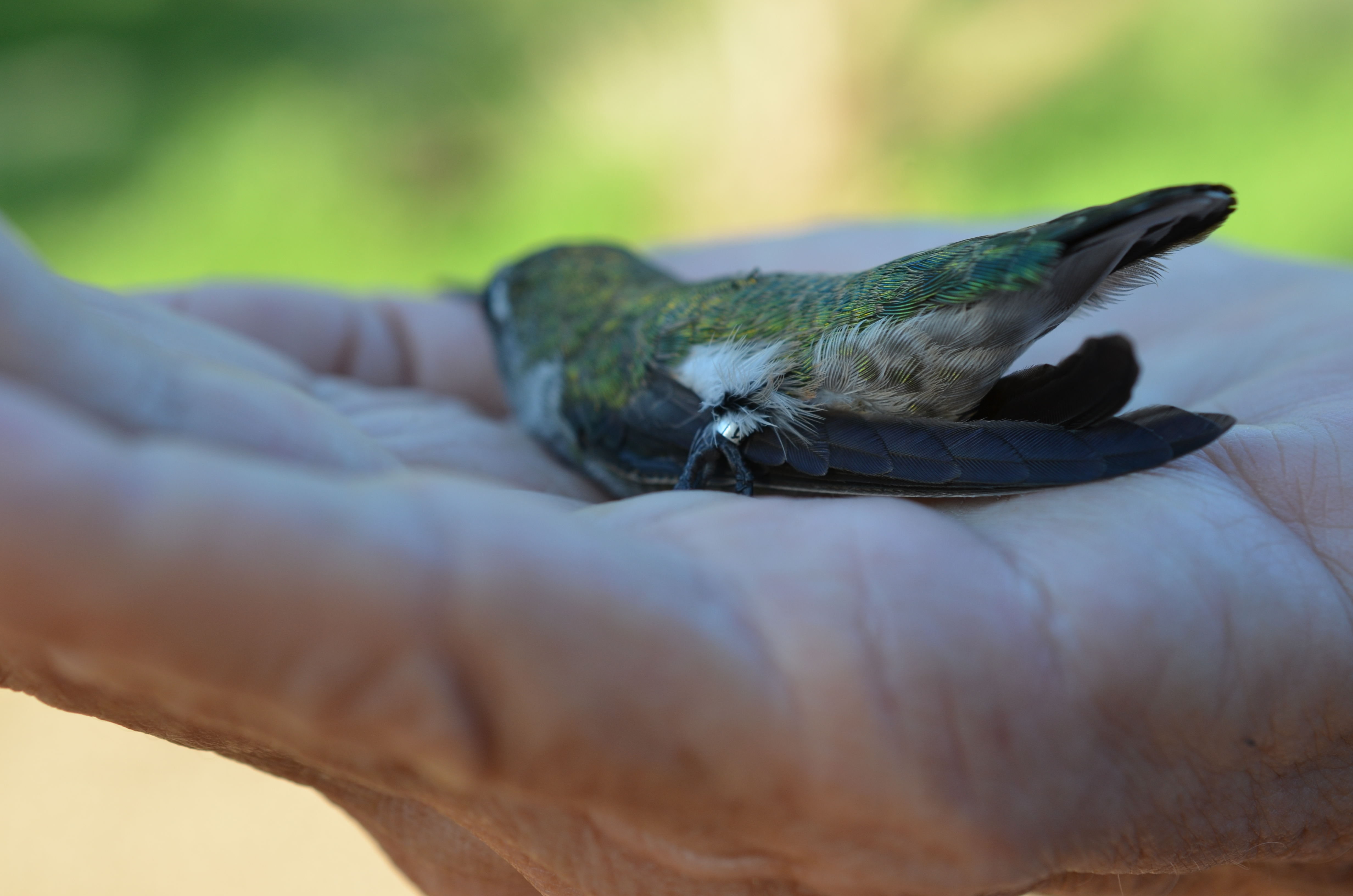 It’s during the precious little moment when the hummingbird is nestled in your hand that you realize someone has flipped a switch and turned everything off in the world. He’s not flitting around or buzzing near your ear like George Jetson. He’s quiet. He’s absolutely still. The frenetic pace of the world that matches the 80-times-per-second wing beats of the hummingbird have come to a screaching halt. Time has stopped and I wait for that moment for the little bird to signal that it’s ready, that it’s time to flip the switch back on.