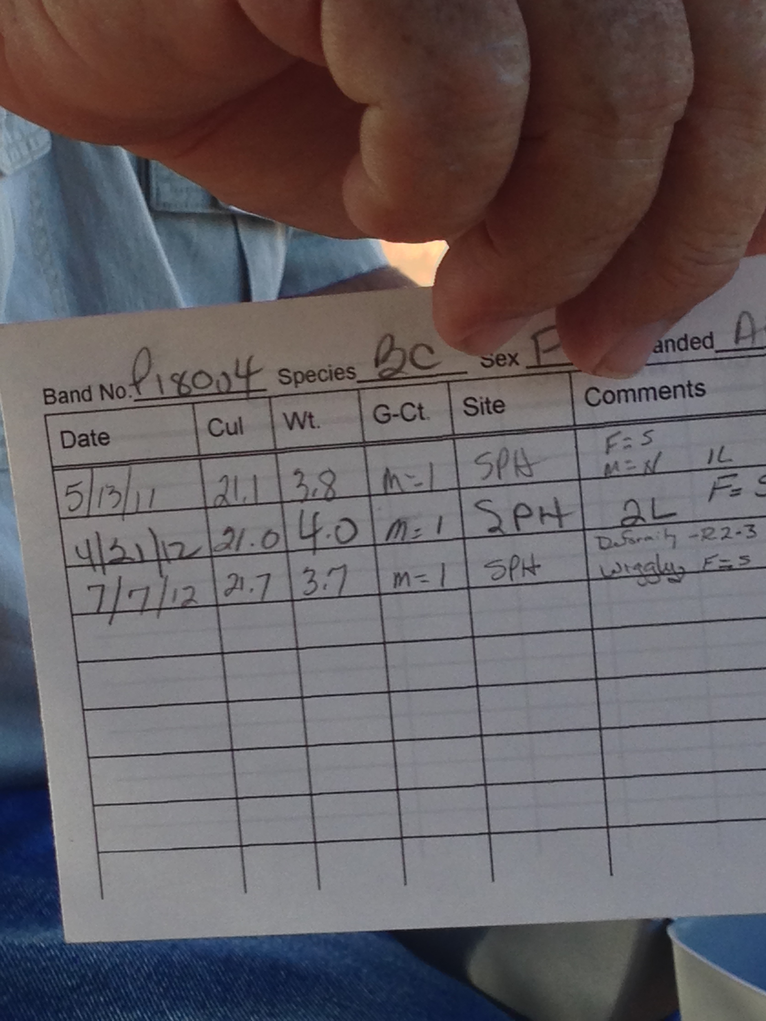 This card shows the data for a female black-chinned hummingbird that has been recaptured two times after its original banding.