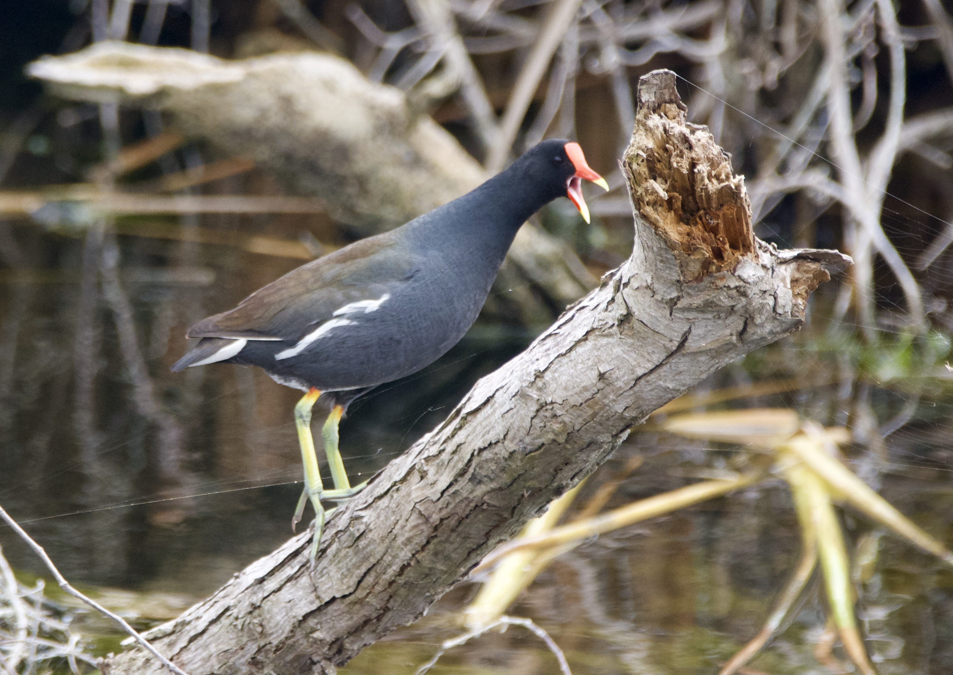 This Common Moorhen (previously known as Common Gallinule) was calling out for at least 10 minutes on this stump, clearly defending his territory.