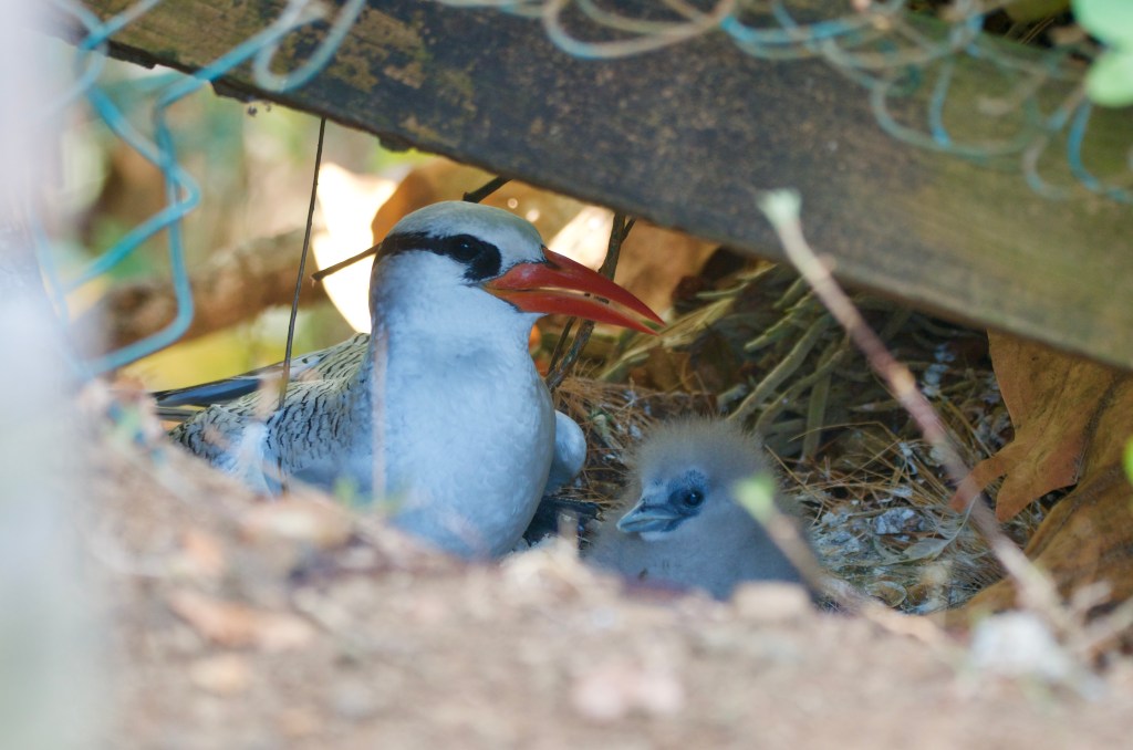 Zee points out the nesting area with adult tropicbirds, each with their single chick. We are careful not to get too close and I’m happy I have the long lens with us to capture this sweet encounter. With each having a young on the nest it’s important for the tropicbirds to successfully outsmart the Magnificent Frigatebirds when bringing food back to their young. Seeing the chicks makes me even more mad at the frigatebirds.