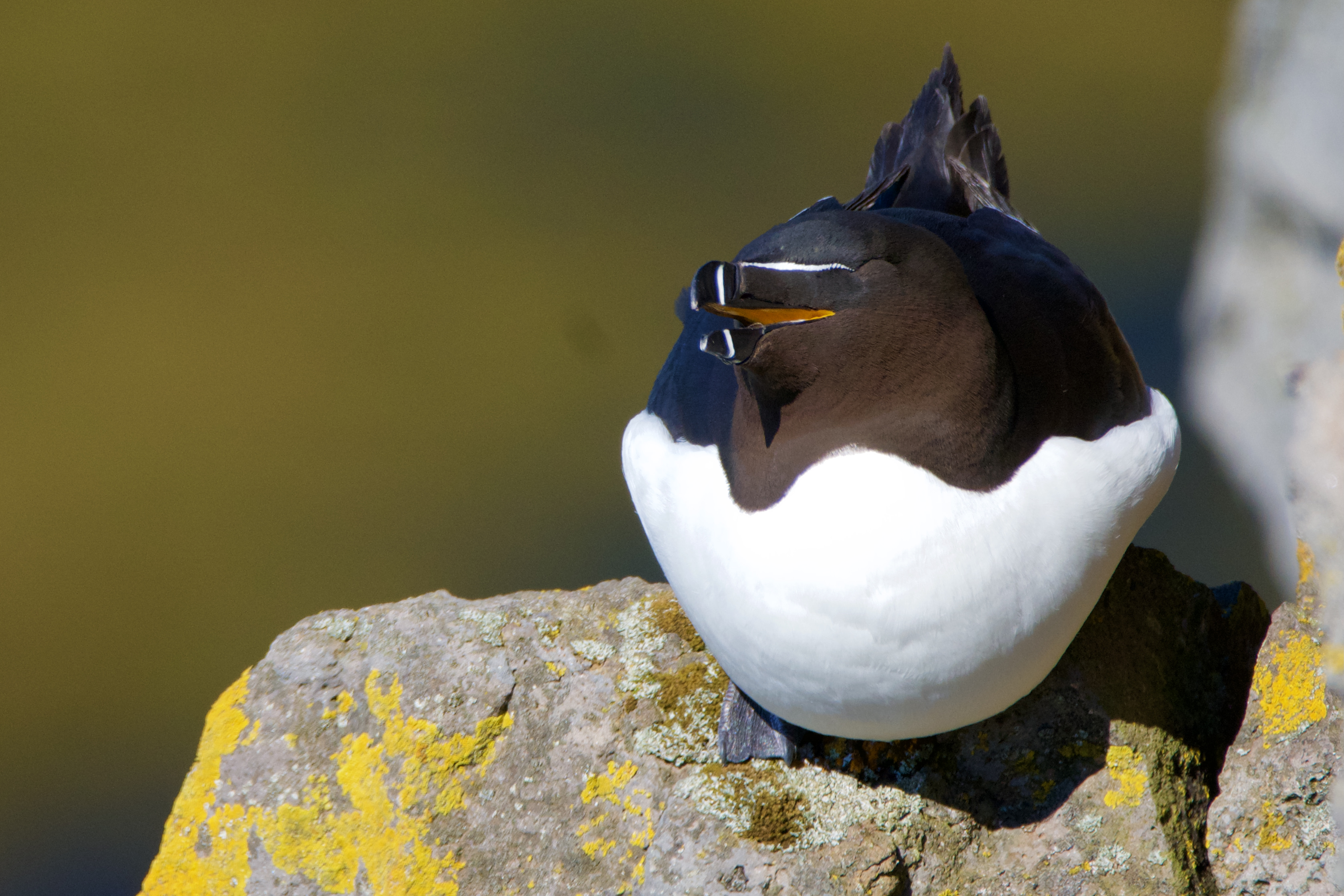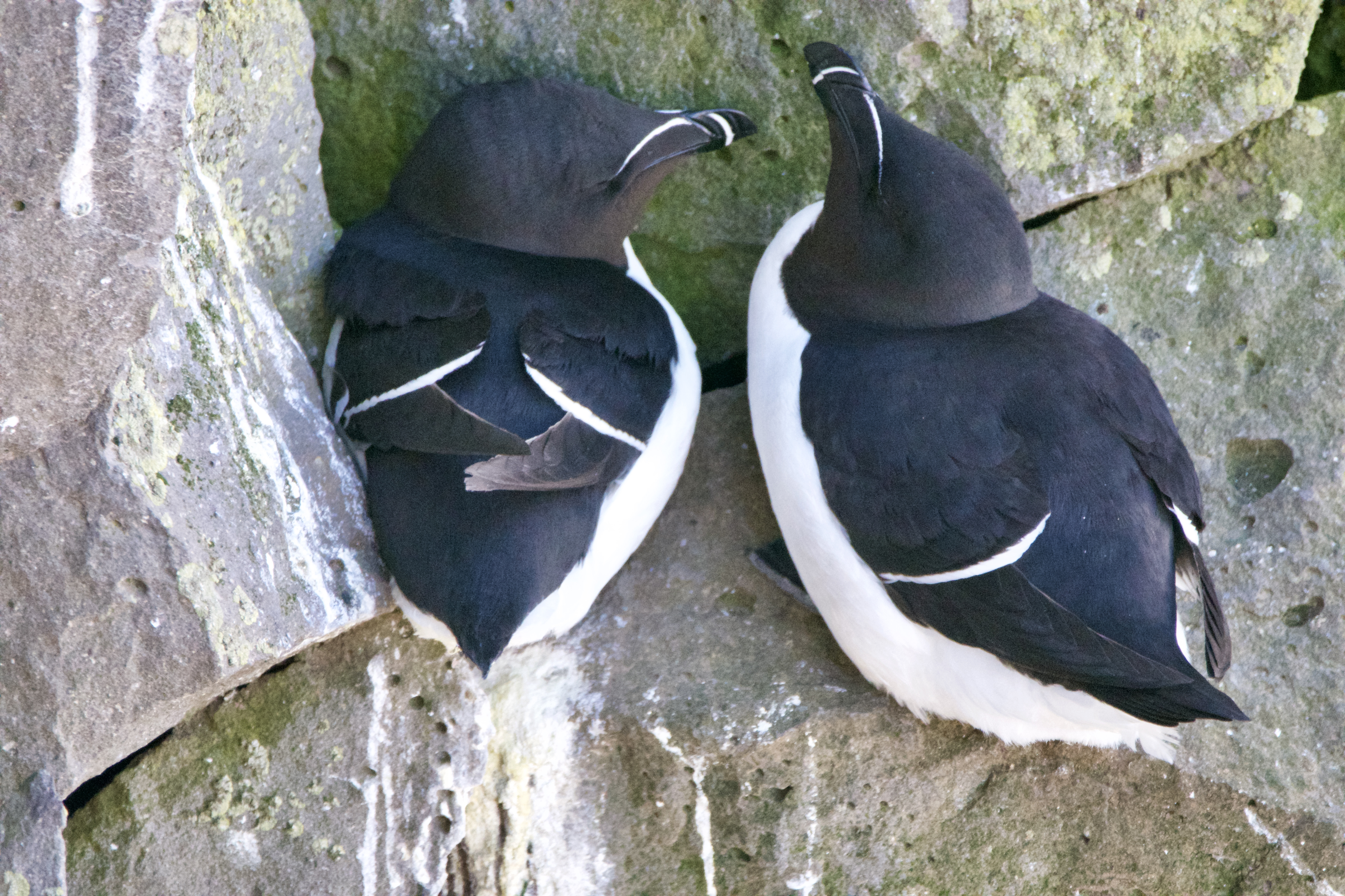 Razor-billed Auks clung to the rocky edge and they, too, lay only one egg each season, though their eggs are conical, and look kind of pointy when Steve showed me a picture. It makes sense when you realize they place their egg in a cleft, which is an opening in the cliff. Of course, Auks aren’t as colorful and comical-looking as the puffins, at least on the outside. But when they opened their mouths, they revealed a yellow-orange mouth the color of the lichen on the rocks.
