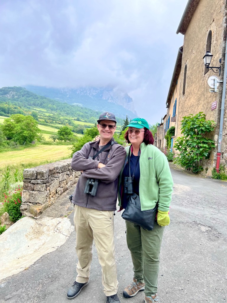 The highlight of the day for me was our trip to the little French village, Bugarach. I’m accustomed to birding on trails in tropical forests, trying not to slip and fall on muddy trails with howler monkeys or spider monkeys above me in the forest canopy. It’s often hot and humid and I’m sweaty. But this stroll through Bugarach was a joy! Passing by centuries-old buildings with pale blue or pale green shutters and household cats inquisitively peering at us through windows.