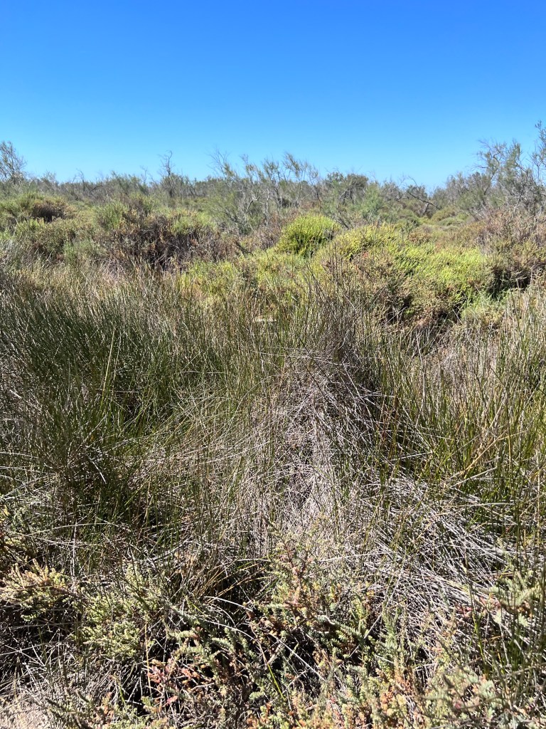 “Trail” was a rather loose term. It used to be a trail, Frédéric explained. But because of the pandemic no one had been on it during the past two years and it was overgrown with tall grasses and brambles. We were searching between a small body of water called “le pébre” and a ruined customs house called “la vignolle” in the Camargue region in the South of France. We were there to hopefully see a breeding colony of Slender-bill Gulls and Gull-billed Terns.