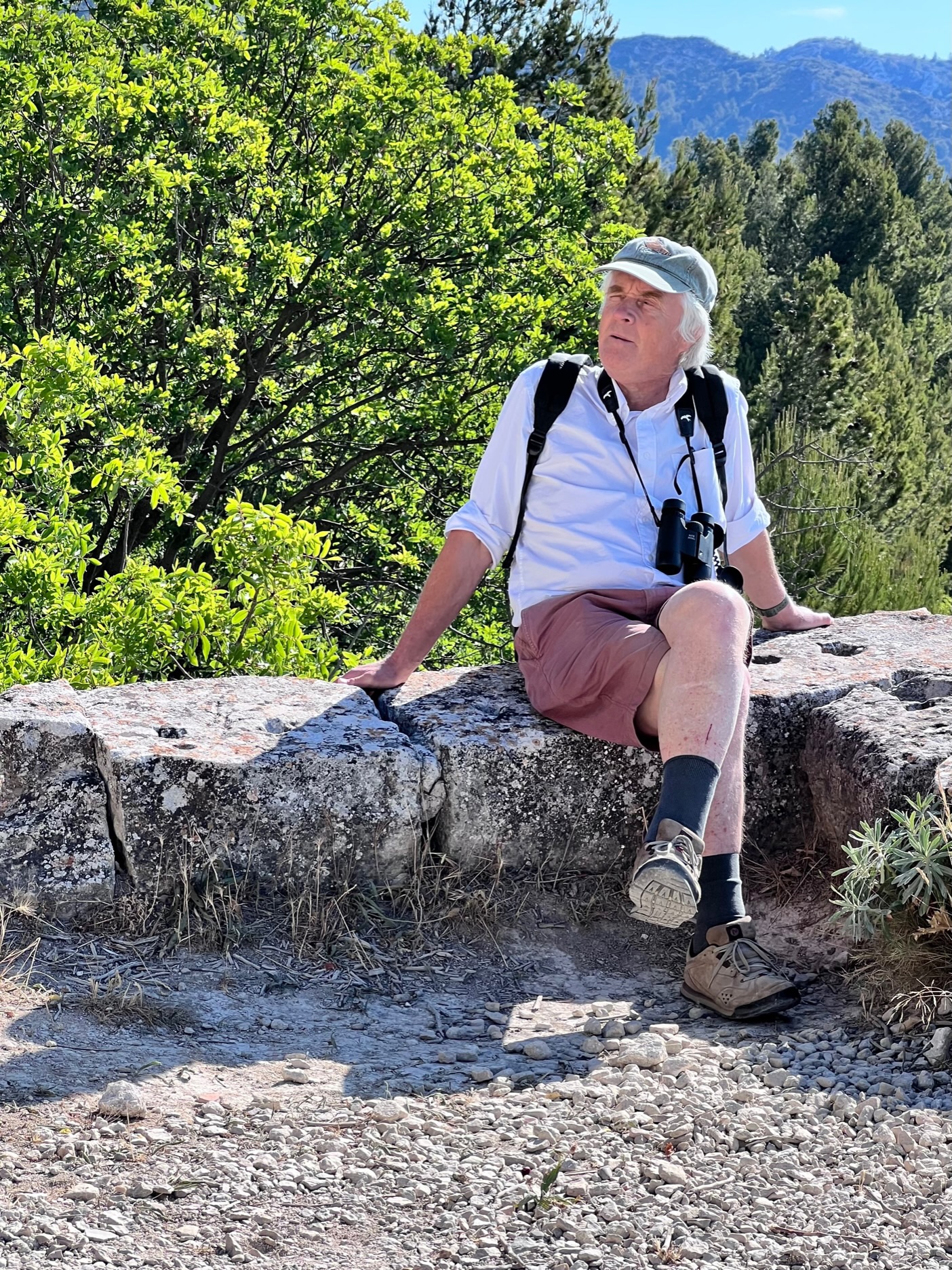 After lunch Frédéric navigated as Steve drove us to a location where Frédéric swore us to secrecy. “There is a Bonelli’s Eagle nest there and we want to protect it,” he explained. “You cannot share where this is.” We assured him we would honor that and we drove for an hour past vineyards and turned onto a dirt road near a grove of pear trees close to a mountain cliff. After a short walk Frédéric pointed out the nest on the cliff’s edge. He set up his scope where we could see two juvenile eagles on the nest made of branches and twigs. One was at the back of the nest while the other stood at the front, stretching its legs and practiced flapping its wings. The parents were nowhere to be found and we could hear the young eagle at the front calling, begging for food. But it was the adult birds we wanted to see.