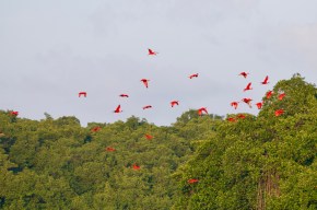 All of a sudden a big flock of Scarlet Ibis fills the sky and swoops into the trees to roost. This goes on for the next 20 minutes as more flocks come in.